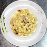 Hot peppers, shrimp, capers, chicken, alfredo sauce, and tortellini pasta.